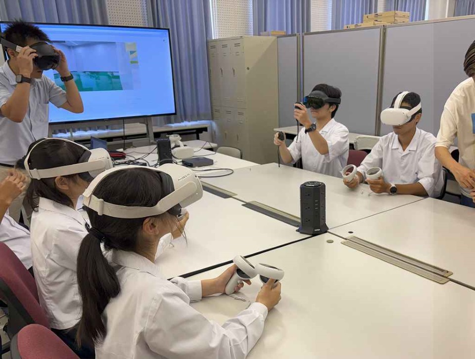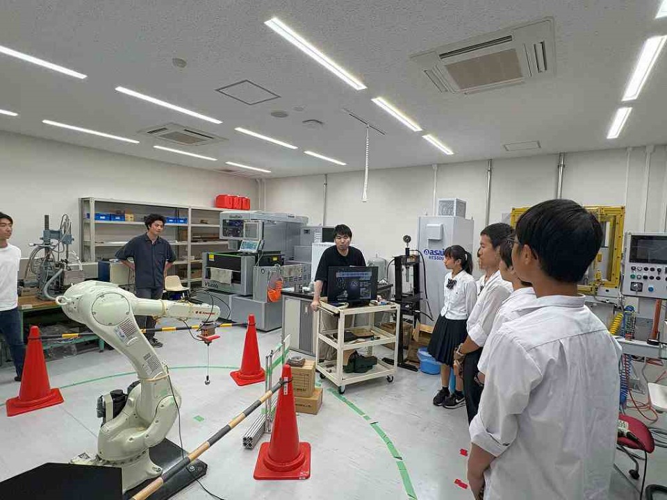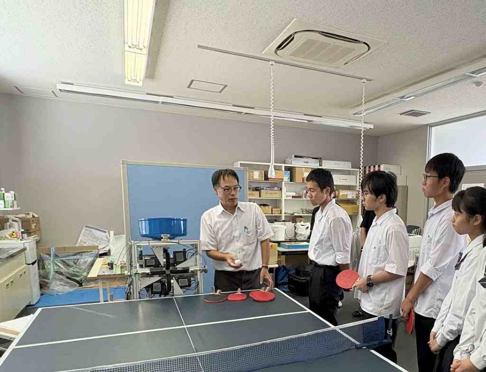 8月22日(金)に、公立小松大学生産システム科学部(粟津キャンパス)を見学してきました。まず学科の概要説明を受けた後、3つの研究室を訪問し、教授や学生の方々から研究内容についてお話を伺いました。研究室では、ピンポン玉の回転軸の違いによって軌道が変化する現象の研究、VRシミュレーターを用いた実験、工場で使用されるロボットアームの振動に関する研究など、普段目にすることのない実験や機械を間近で見ることができました。生徒たちは、軌道の変わるピンポン玉を打ち返す体験や、VRゴーグルを装着して機械操作のシミュレーションを体験するなど、実際に研究に触れることができ、非常に満足している様子でした。