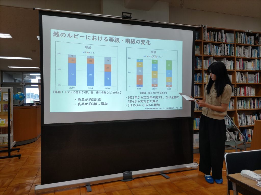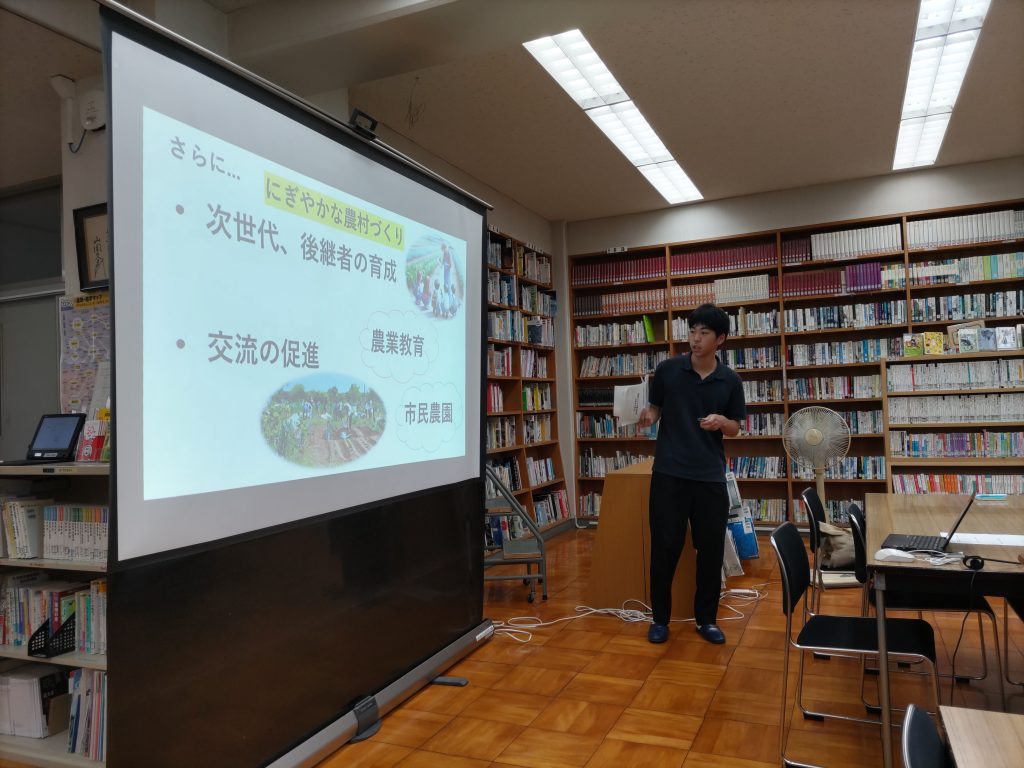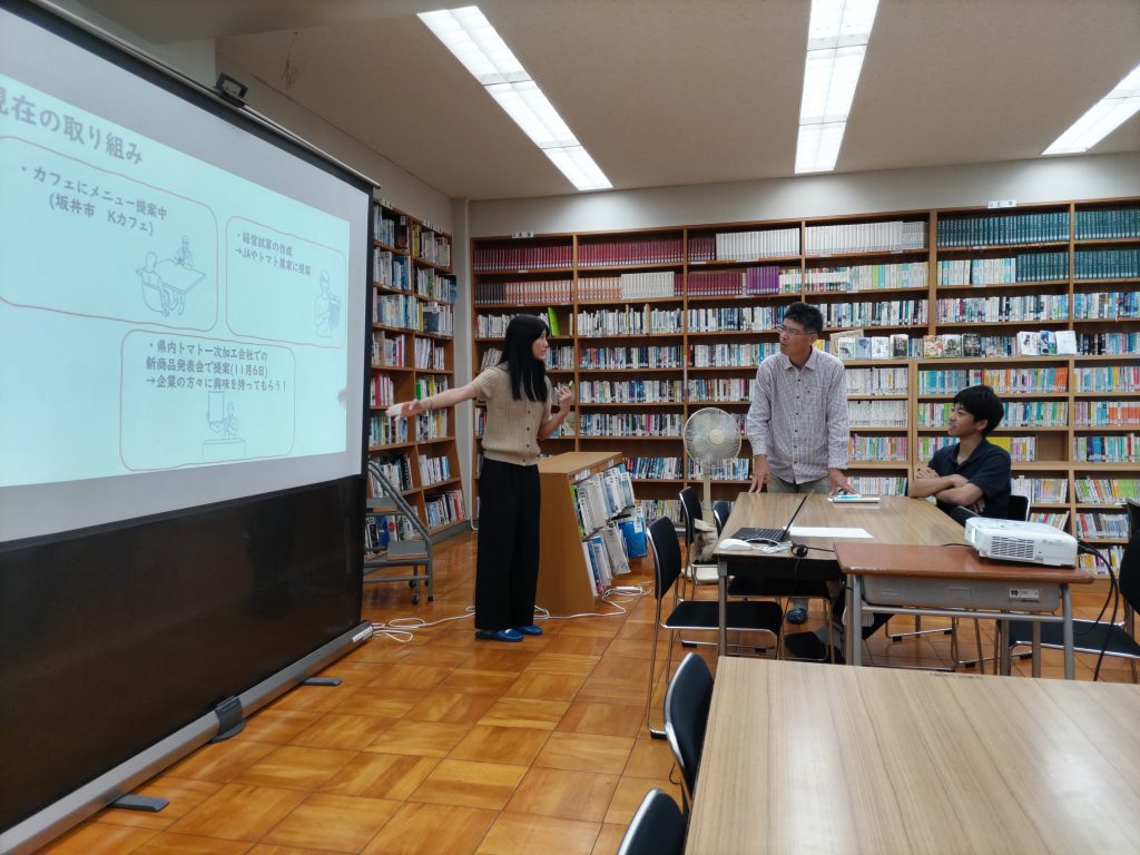 今回は「地域農政学 地域農業の活性化が地域の活力を生む! ~6次産業が救う日本農業~」のテーマのもと、創造農学科の村井耕二教授による趣旨説明、2名の大学生による「県産トマト菜を使用した新商品の開発」「若者がめざす新規就農モデルの構築」という研究発表をお聞きしました。