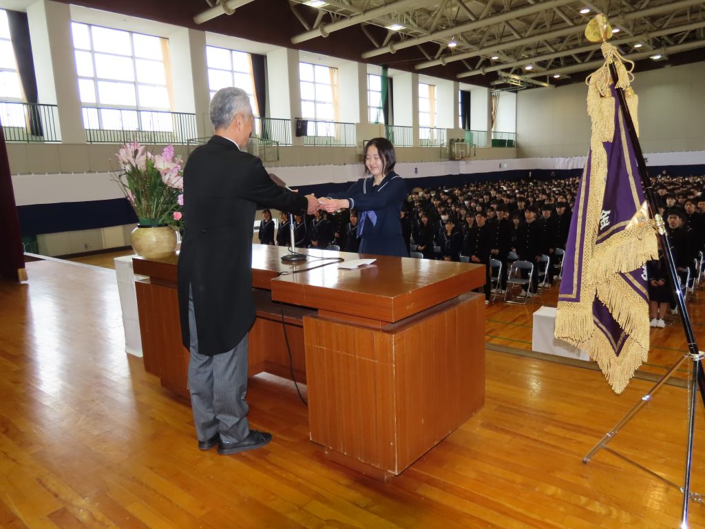 式では国歌斉唱に続いて、まず渡邉敬重さんが卒業生を代表して卒業証書を受領しました。